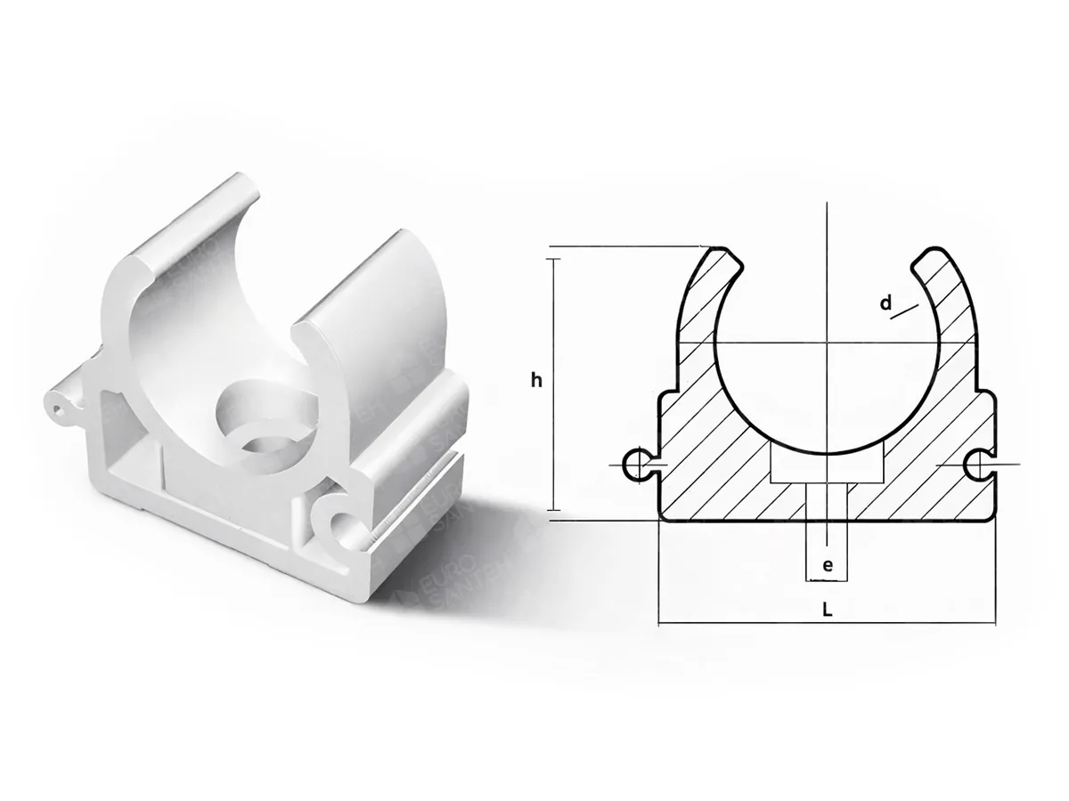 Clema d.50 este un suport de tip clipsare: țeava PPR se introduce în locaș și se fixează printr-o tensiune elastică. Acest lucru accelerează montajul și îl face comod chiar și pe trasee lungi. Datorită formei corecte, clema ține țeava ferm, dar fără „strangulare” excesivă — un aspect important pentru polipropilenă, care se dilată la încălzire. Astfel, fixarea susține traseul fără a crea tensiuni inutile, reducând riscul de abateri, „valuri” pe segmentele drepte și încărcări suplimentare în zonele de îmbinare.