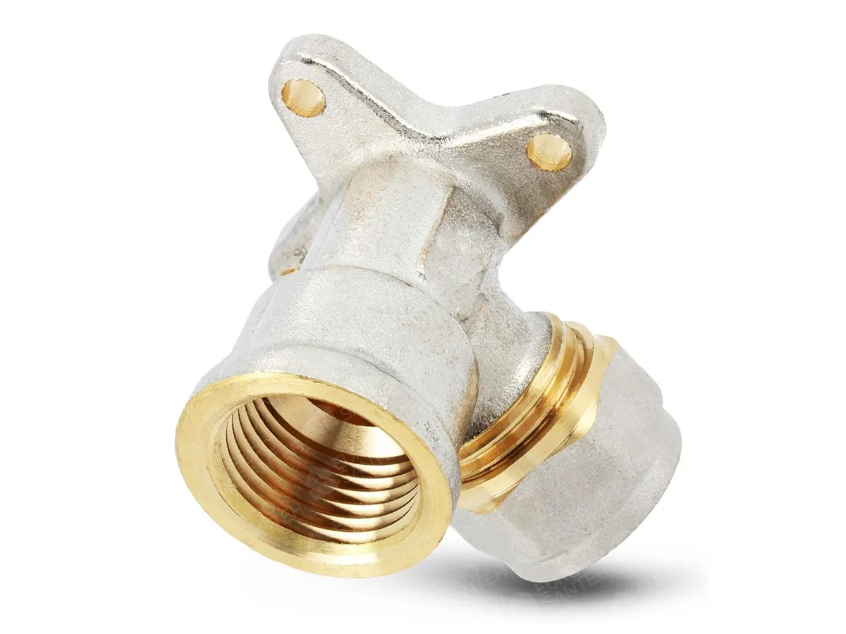 Colț cu flanșă pentru țeavă din metal-plastic Colțul cu flanșă pentru țeavă din metal-plastic – un element universal al sistemului de conducte, asigurând o conexiune fiabilă și schimbarea direcției conductei la 90 de grade. Datorită prezenței flanșei, acest fiting permite prinderea ușoară a conductelor pe diferite suprafețe, simplificând lucrările de montaj.