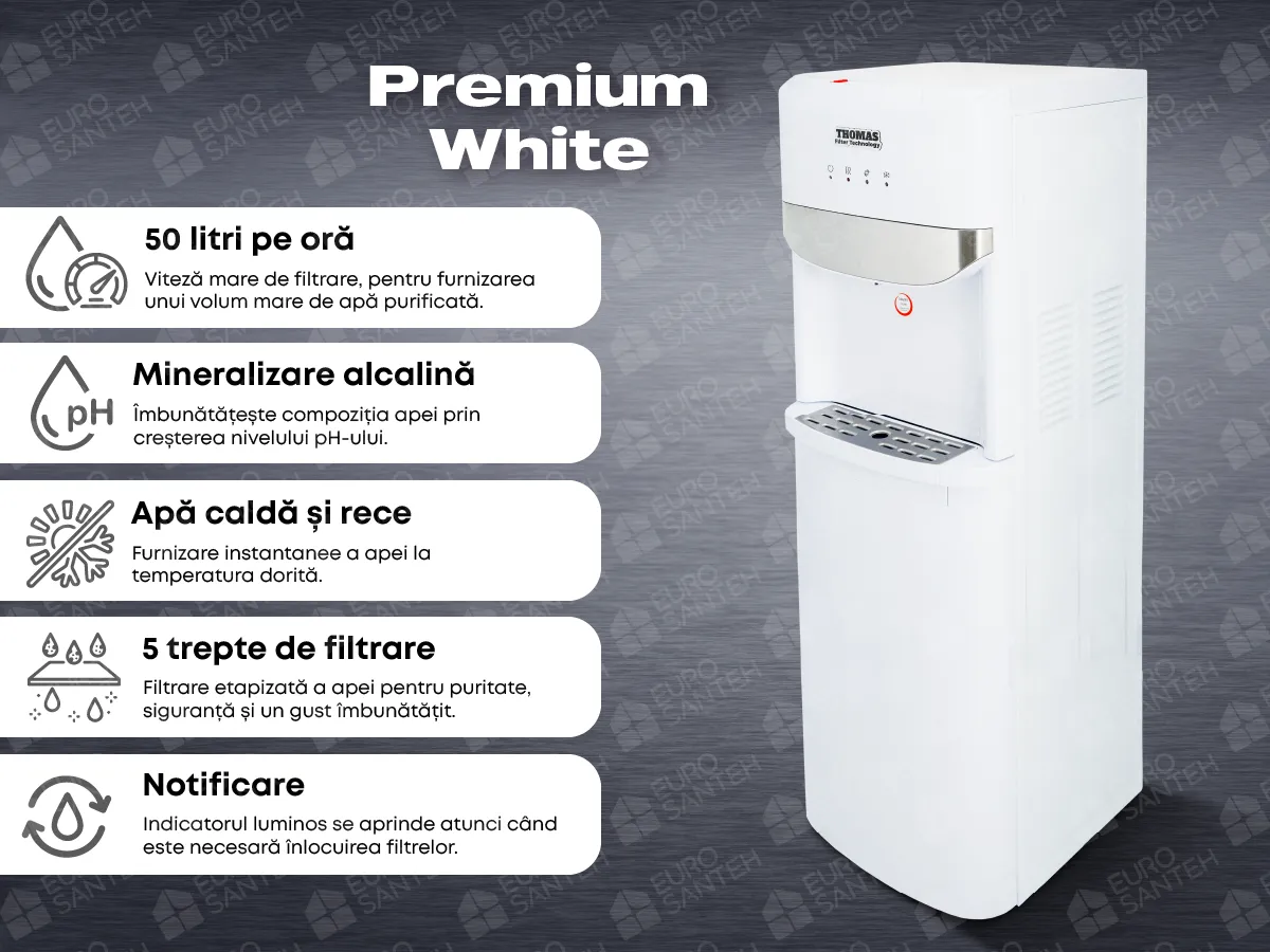Suzuki Premium White este un dispenser de podea de nouă generație, care combină funcționalitatea sistemului de osmoză inversă, mineralizarea alcalină și confortul livrării apei la temperaturi diferite. Conceput pentru cei care își doresc nu doar apă curată, ci apă purificată, alcalinizată și disponibilă instantaneu – rece, fierbinte sau la temperatura camerei.