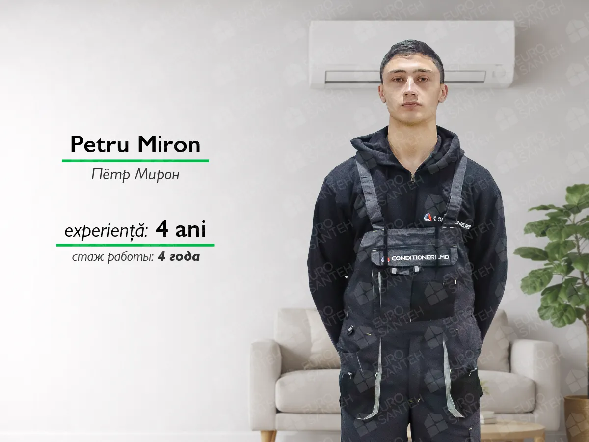 Petru Miron, în vârstă de 22 de ani, este ajutorul lui Radu Miron în echipa de montaj. Cu o experiență de lucru de 4 ani, Petru își aduce contribuția la proiecte alături de echipa sa cu entuziasm și dăruire. Deși nu deține permis de conducere, el este dedicat și gata să învețe și să se adapteze în orice situație pentru a-și îndeplini responsabilitățile.