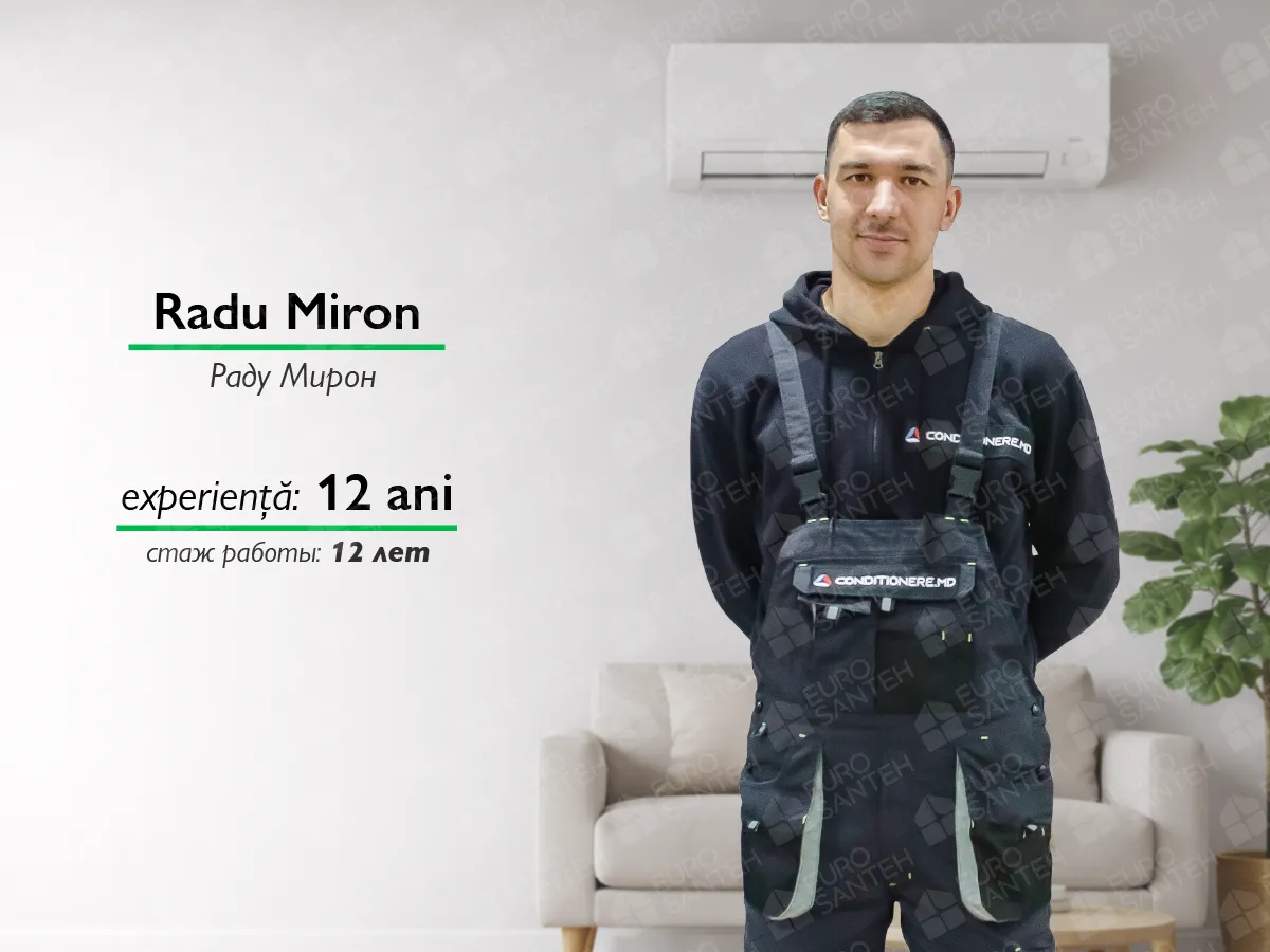 Starea sa civilă, căsătorit și cu 2 copii, sugerează că este o persoană responsabilă și dedicată, capabilă să gestioneze atât cerințele profesionale, cât și cele personale cu succes. Fiind expert în montarea sistemelor de climatizare și a cazanelor, Radu aduce un nivel ridicat de specializare și cunoștințe în acest domeniu specific. Cu o vastă experiență și o abordare dedicată față de munca sa, Radu Miron este un montator cu încredere, capabil să ofere servicii de calitate în domeniul său de expertiză.