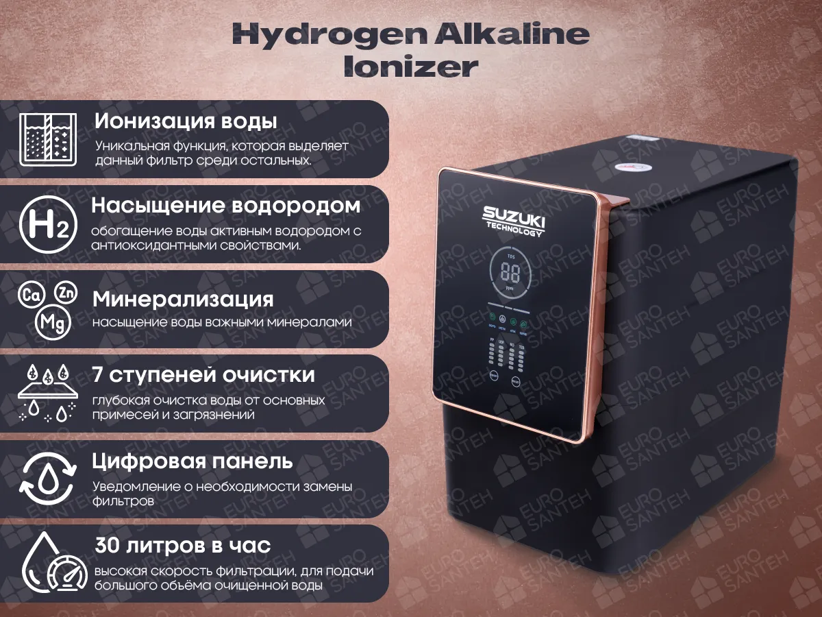 Suzuki Hydrogen Alkaline Ionizer — это премиальная система водоочистки нового поколения, сочетающая глубокую очистку методом обратного осмоса с технологией ионизации, обогащением минералами и водородной активацией воды. Это не просто фильтр, а полноценная интеллектуальная станция, обеспечивающая вас идеально чистой, живой и энергетически насыщенной водой каждый день.