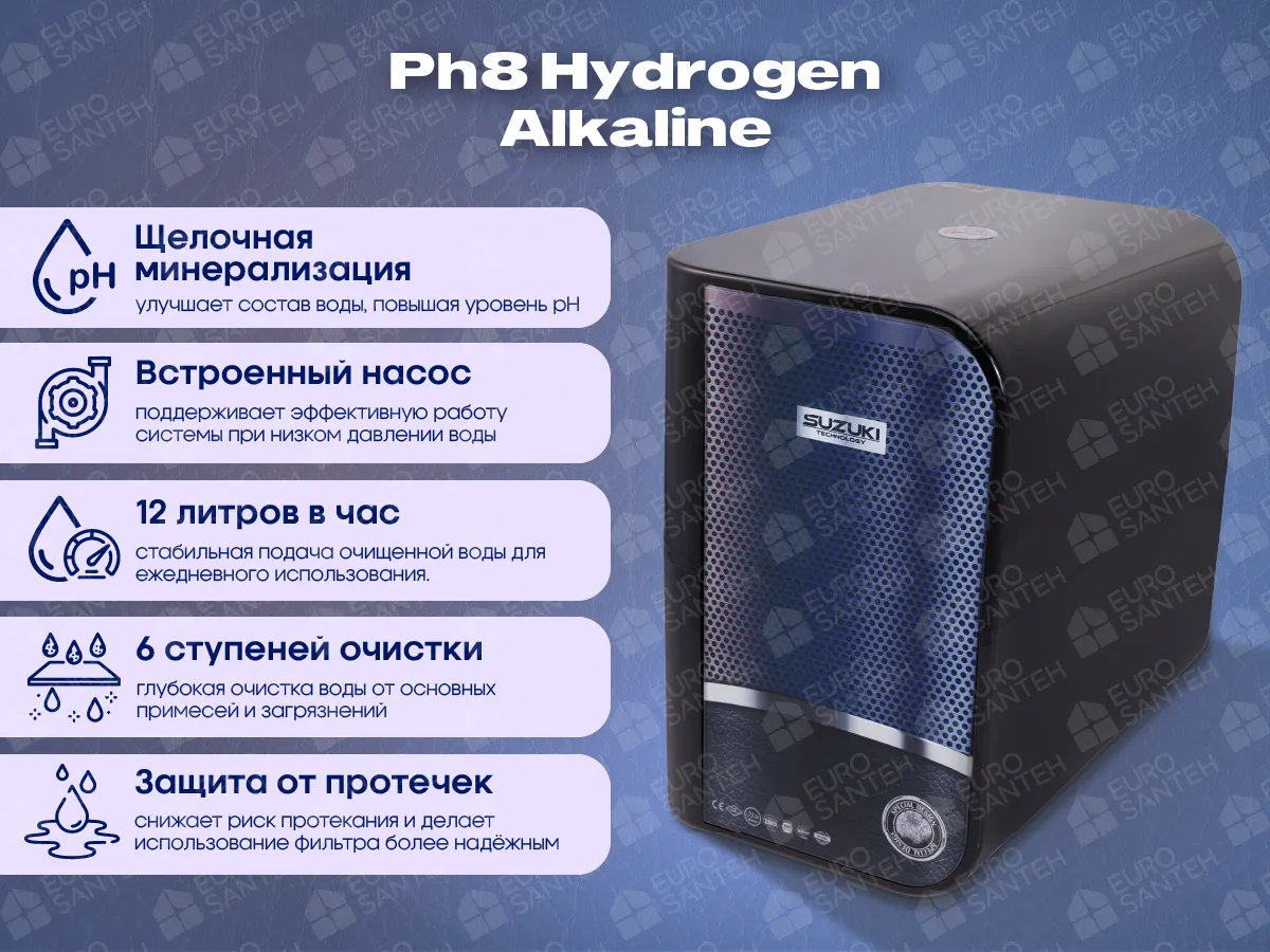 Suzuki Ph8 Hydrogen Alkaline — это инновационная система водоочистки, объединяющая немецкую технологию, японскую мембрану и европейские стандарты качества в компактном корпусе премиального дизайна. Оснащённая обратноосмотической системой фильтрации, водородной генерацией и щелочной минерализацией, она обеспечивает подачу не просто чистой воды, а структурированной, насыщенной и полезной для здоровья.