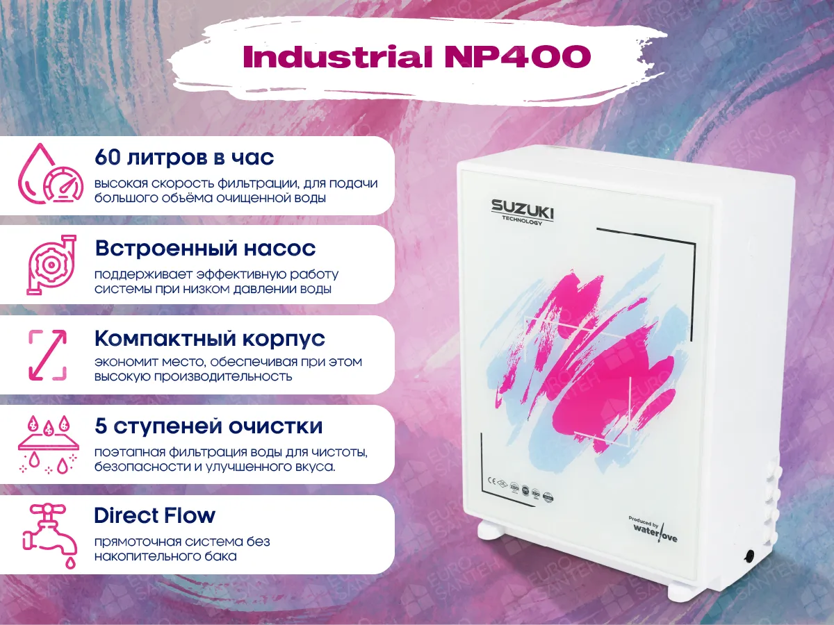 Suzuki INDUSTRIAL NP400 — это профессиональный уровень водоочистки, помещённый в компактный, лёгкий и надёжный корпус. Он разработан для тех, кто требует от фильтра максимальной эффективности, мобильности и простоты. С ним вы всегда будете уверены, что у вас под рукой вода без компромиссов — чистая, безопасная и полезная. Независимо от того, где вы находитесь — в доме, офисе или автодоме — Suzuki обеспечит вас качественной водой каждый день.