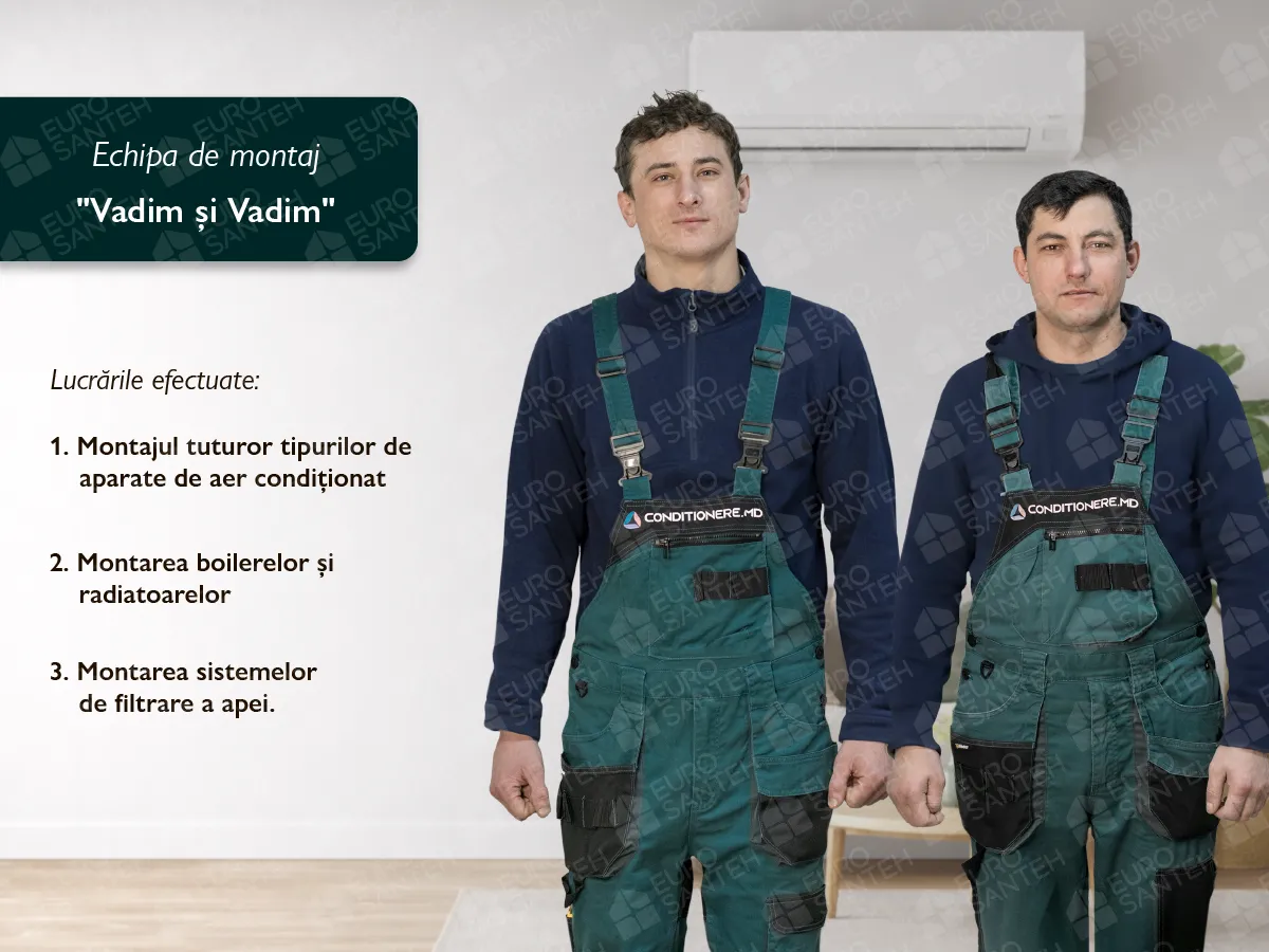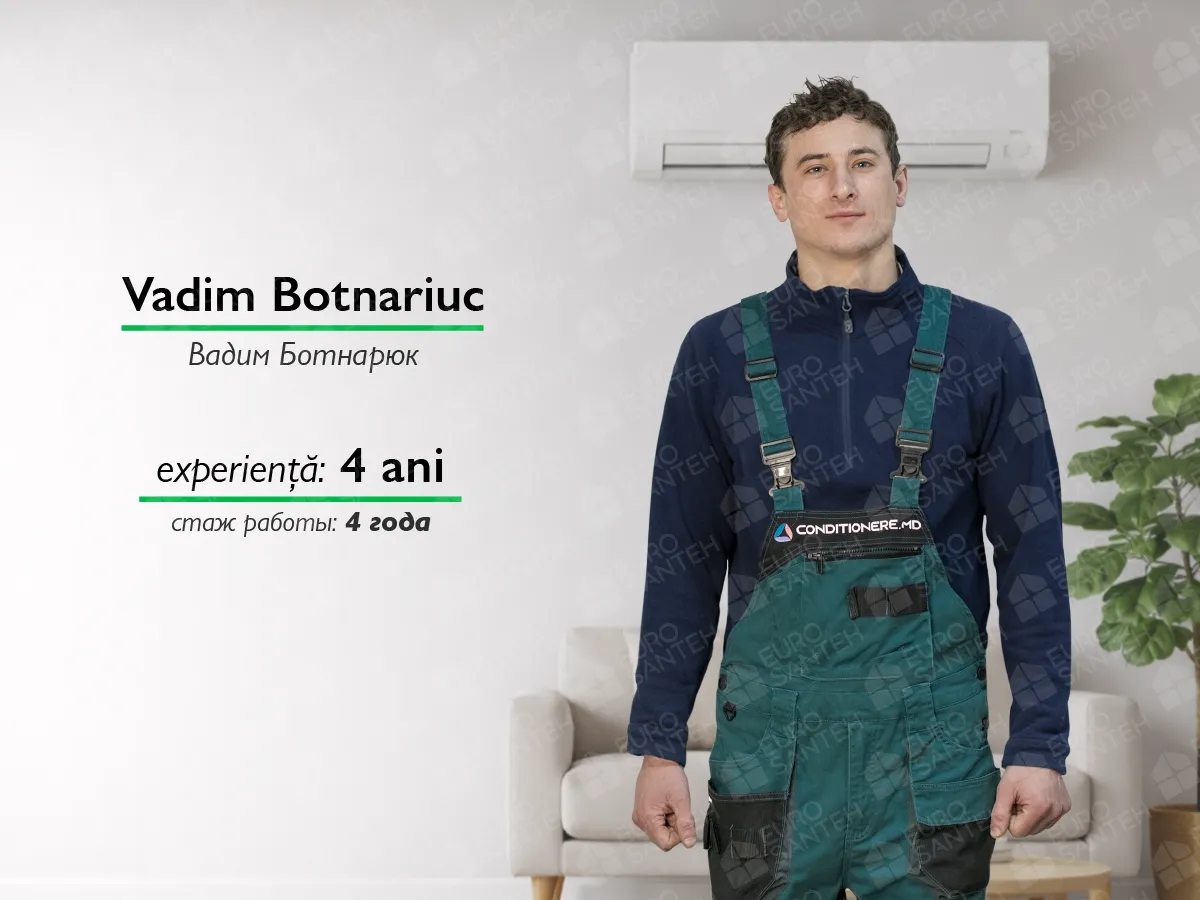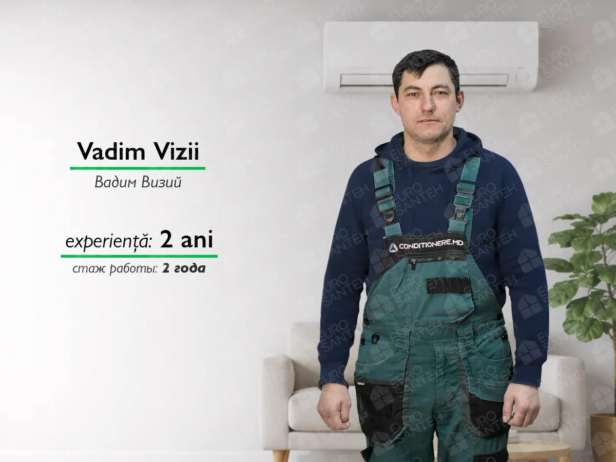 Vadim Vizii — ajutor de montator, cu 2 ani de experiență în domeniul instalării echipamentelor climatice. Lucrând în echipă cu montatorul principal, el asigură o organizare clară a lucrărilor la obiectiv: pregătește sculele și materialele, asistă la montarea și conectarea echipamentului, menține ordinea și controlează siguranța zonei de lucru.